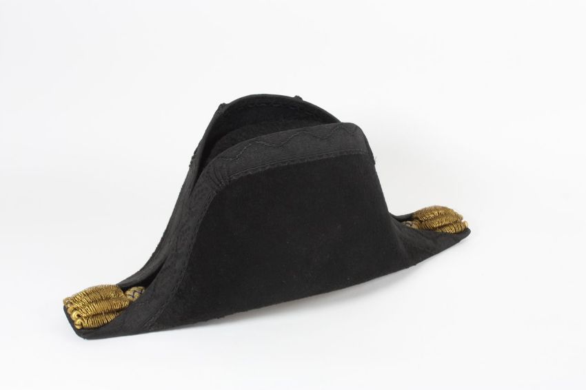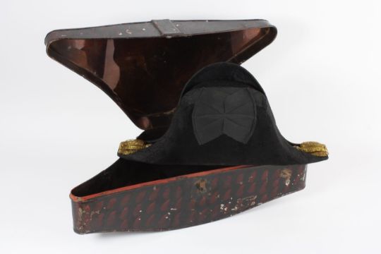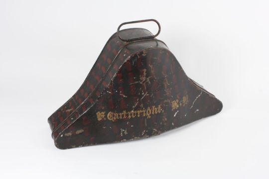 A felt bicorn hat contained within a fitted tin case with gilt lettering reading F. Cartwright R.NDimensions: length 38cmCondition reportA little tired, but generally in fair condition