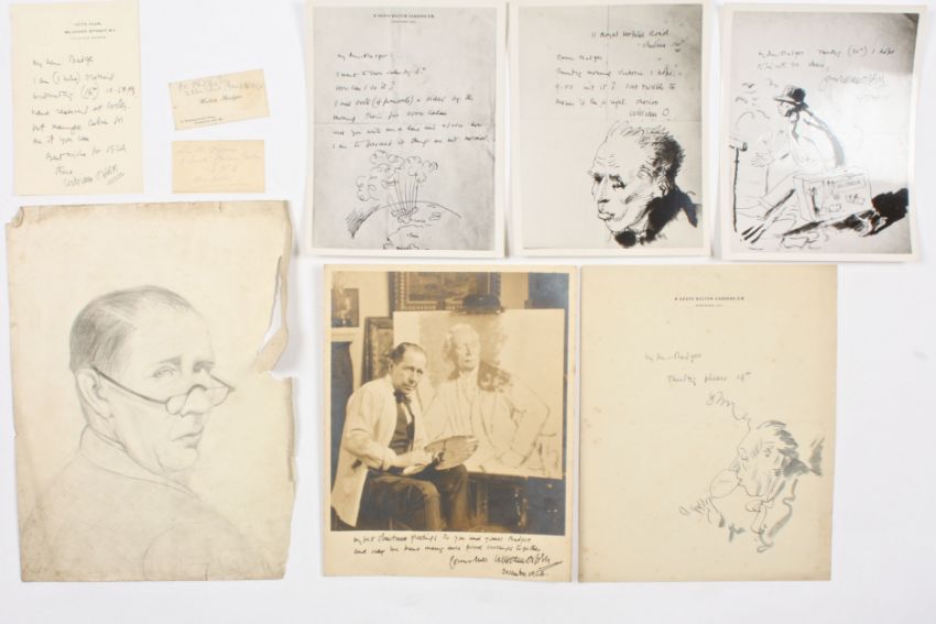 Sir William Orpen (1878-1931) Irish A letter to Mr. Walter James Badger, Chief Inspector of the Pullman Car Co. Ltd, with a sketch of a man drinking from a glass, on headed note paper from 8 South Bolton Gardens; together with a signed photograph of the artist at his easel, wishing Christmas greetings, signed and dated 1926; a sketch of Orpen by Badger and three photographs of Orpen letters.Dimensions: Condition report