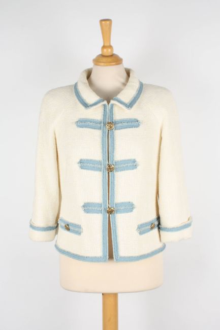 A Chanel cream boucle jacket. with light blue trim, gold coloured Chanel buttons, two faux pockets with logo buttons, European 40.Dimensions: Condition reportFairly good condition. Cotton and Nylon, and 96% silk lining. With Chanel hanger