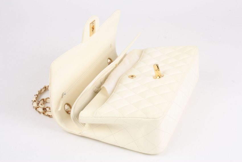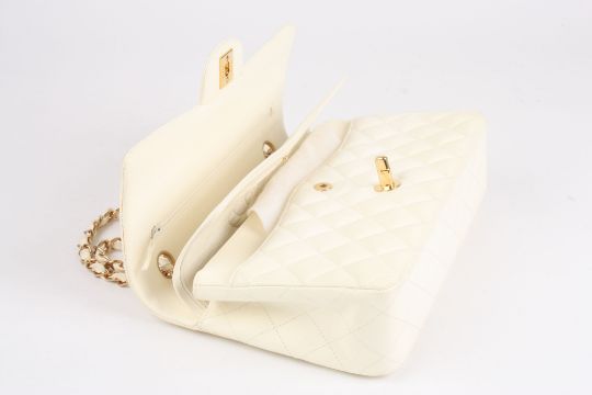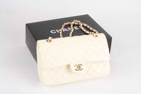 A leather quilted cream coloured Chanel handbag the leather double flap bag from Chanel featuring a rectangular body, a front flap closure, a quilted effect, a gold tone logo, a chain and leather strap, flip lock closure, multiple interior compartments, a back slip pocket, an inside flap closure. With original dust bag, original box and certificate of authenticationDimensions: 25cm by 16cmCondition reportGood condition but some marks to back.ProvenanceFrom a private collection