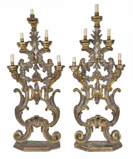 A pair of large carved and decorative gilt wood torcheres possibly late 18th century/early 19th century with scroll bases and each with five sconcesDimensions: height 120cm, width 50cmCondition reportOne with two restored breaks, and other with one. Overall with some restoration and general wear with age. Slightly unstable.