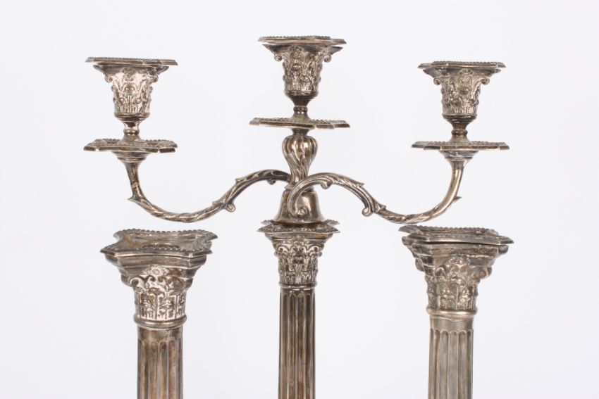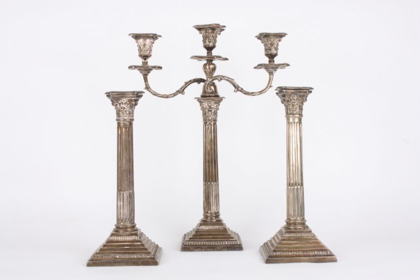 A pair of George V silver Corinthian column candlesticks and a matched Edwardian candelabra, hallmarked Birmingham 1933 (sticks) and Birmingham 1902, all with Corinthian column capitals, scrolling branches and fluted columns to stepped beaded bases.Dimensions: Pair of sticks: 26.8 ozt. Candelabra 49.6 ozt total weight.Condition reportPair of sticks lacking filling. Tarnished, overall reasonably good condition.