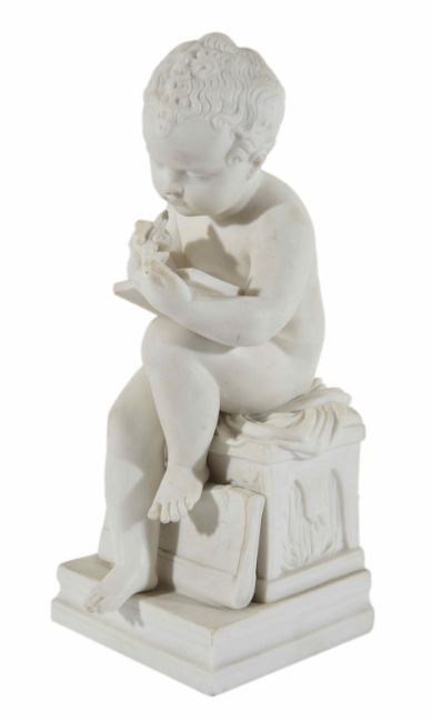 A parian figure of a young boy seated in a thoughtful pose with one knee bent up, scribing Dimensions: height 28cmCondition reportGood overall condition with no obvious damage.