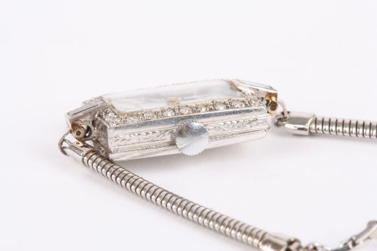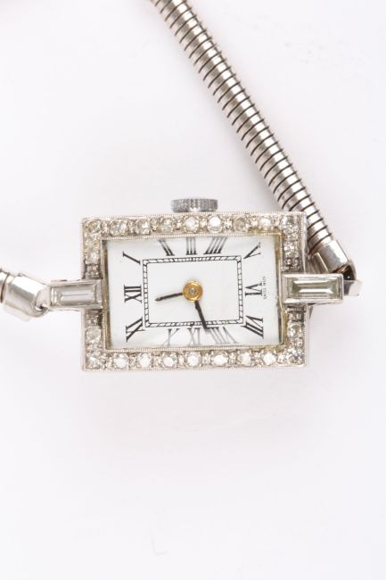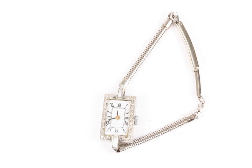 A ladies Art deco style diamond cocktail watch the white rectangular shaped dial surrounded by small diamonds interspersed with diamond points, with baguette cut diamonds to either end and flexible strap, the strap unmarked but the catch inscribed 12K gold filled Dimensions: total weight 14.7gCondition reportIn need of a clean the movement appears to work as watch goes, but movement has not been tested.