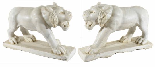 A pair of decorative white marble lions realistically modelled, in standing poses, on marble bases Dimensions: 49 x 43xmCondition reportGeneral wear with no major condition issues.