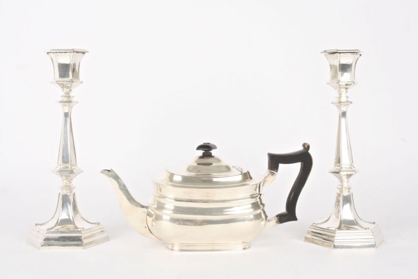 A silver teapot hallmarked London 1905 of squat form with ebonised handle and knop, together with a pair of silver plated candlesticks with hexagonal basesDimensions: weight of teapot 22oztCondition reportSome wear to handle and knop but generally in good condition with good clear hallmark
