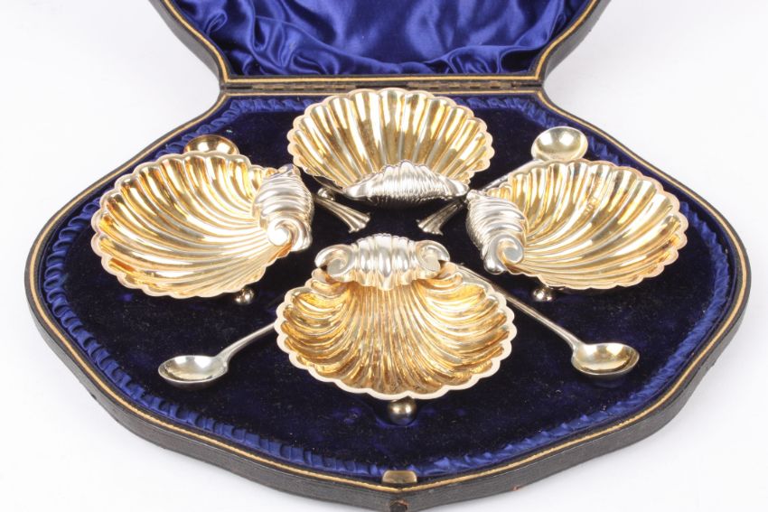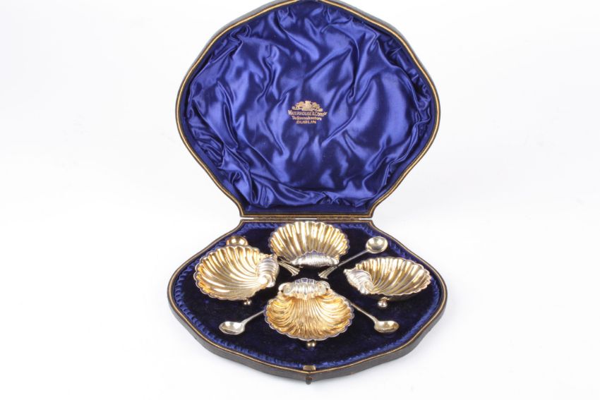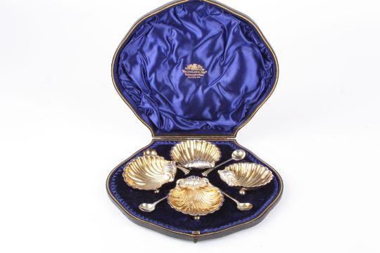 A set of six Victorian silver gilt shell shaped salts hallmarked London 1895, together with matching spoons in a fitted case. Makers mark: Josiah Williams & Co. Retailed by Waterhouse & Co., Dublin, Ireland. In a fitted leather case.Dimensions: 4.3 ozt total weight.Condition reportGenerally good condition.