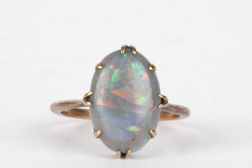 A 9ct gold and opal ring the oval opal in an eight claw plain setting.Dimensions: Size N.Condition reportTarnished and some wear.