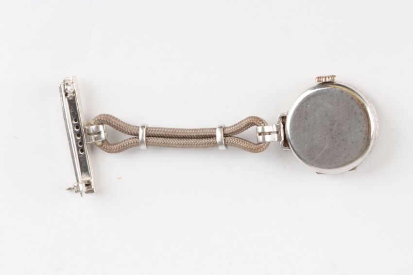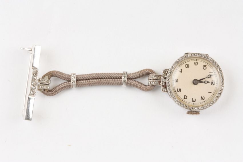 An 18ct white gold nurses fob watch the silvered dial, surrounded by a diamond chip bezel and suspended from a diamond bar. The case hallmarked London 1925.Dimensions: Case 19mmCondition reportGenerally good condition, movement winds and works.
