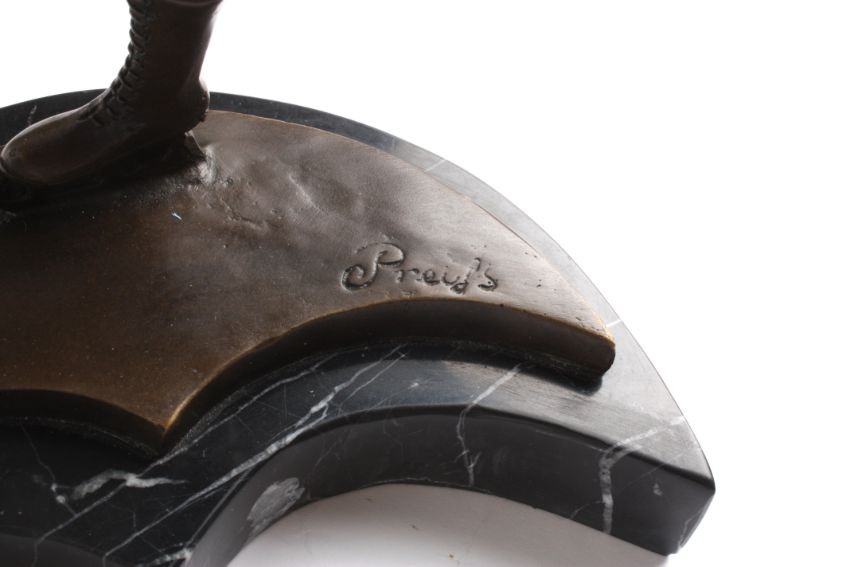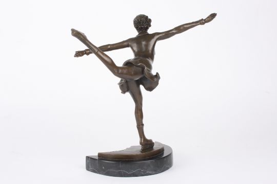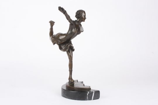 After Ferdinand Preiss A contemporary bronze model of an ice skater, gliding on one leg and supported on a crescent shaped base and marble plinth, signed.Dimensions: 29 cm high.Condition reportGood condition, no damage, tiny 2mm nick to front left marble corner.