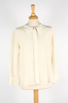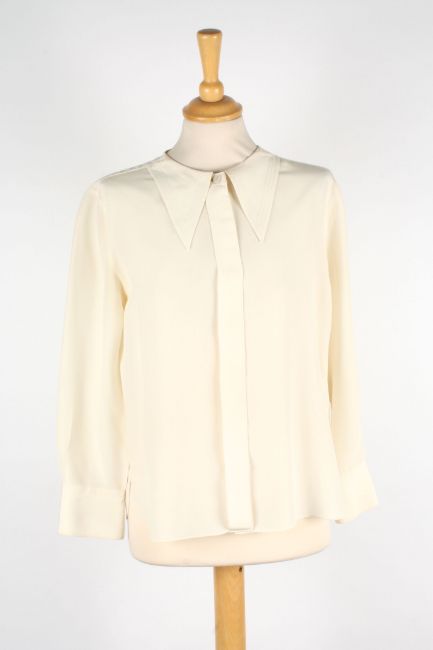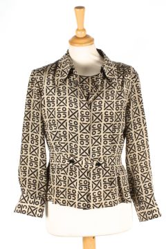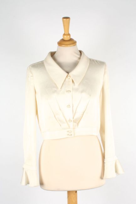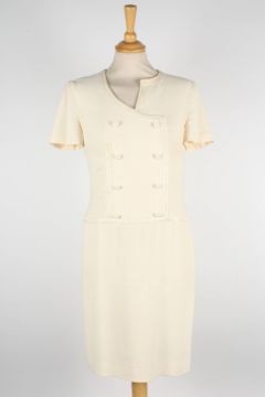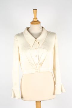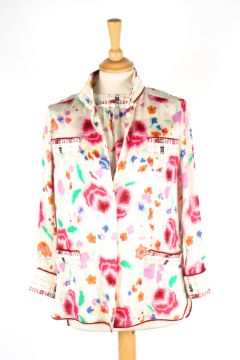 A collection of Chanel blouses the first brown and black patterned vest top and matching blouse, the second flowered pattern vest and blouse, the third oyster coloured silk skirt, the fourth a cropped cream blouse, the fifth cream blouse, the sixth a cream vest top with pleats to front, together with a cream dress with decorative flower buttons to front, various sizes (7)Dimensions: Condition reportThe cream blouses and dress with some staining one with a significant to reverse. All on fair condition apart from cream blouses.