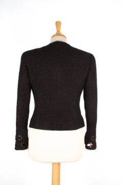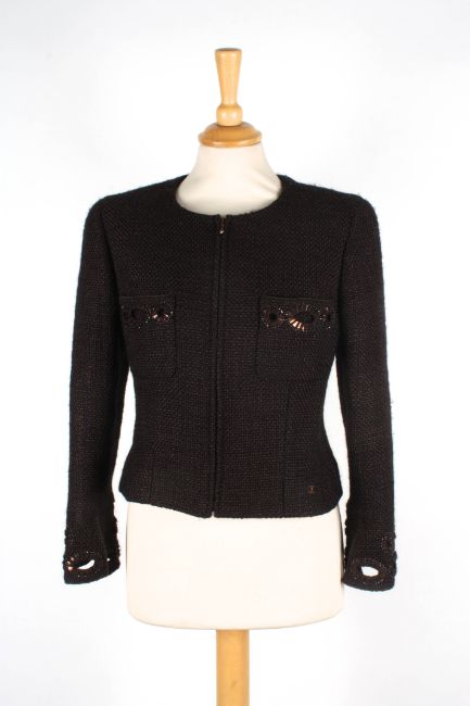 A brown Chanel wool jacket with zip to front and two pockets to breast, with cut out patterns with brown metallic beading to pockets and cuffs, the cuffs also with splits, small logo to side, European size 38 Dimensions: Condition reportIn very good condition