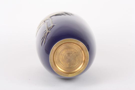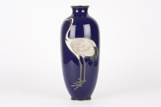 An early 20th century Japanese cloisonné vase decorated with a crane in relief upon a rich blue ground. Supported on a carved wooden stand.Dimensions: 30.5 cm high.Condition reportSeveral hairlines to the blue ground, some crazing to the cranes body.