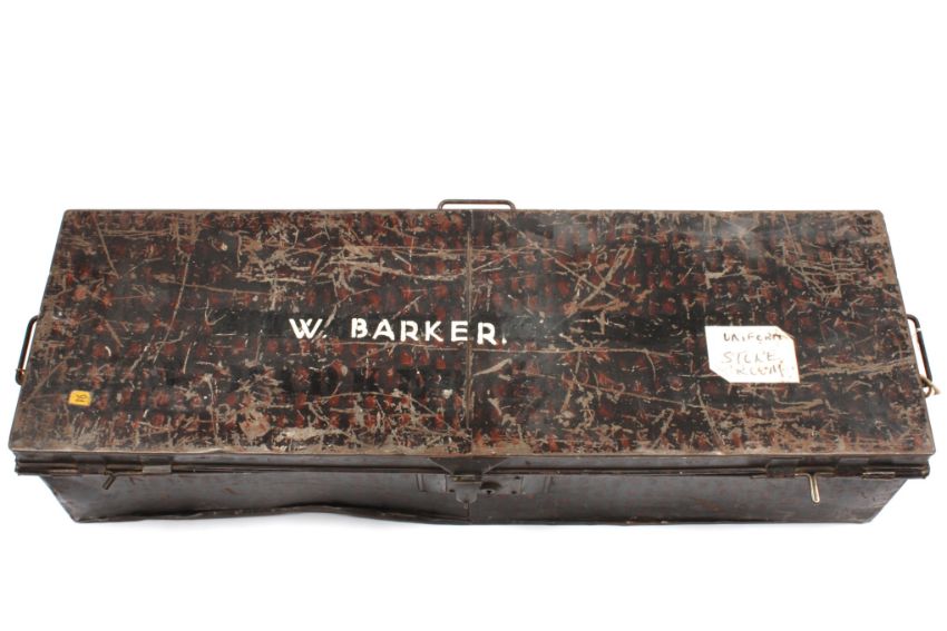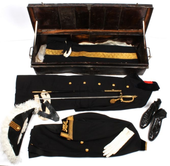 A 20th century Ambassadors Uniform belonging to Sir William Barker circa 1960, comprising a jacket with gold braid and trousers, shoes, white leather gloves, and an overcoat with fur trim, together with a bicorn hat trimmed with ostrich feathers and a sword by Thresher and Glenny, all contained in a metal trunk. Note: Barker was the Ambassador to Czechoslovakia from 1966-1968 during the Prague Spring.Dimensions: Condition reportIn generally good condition.