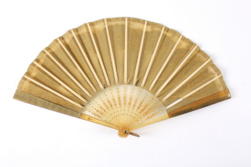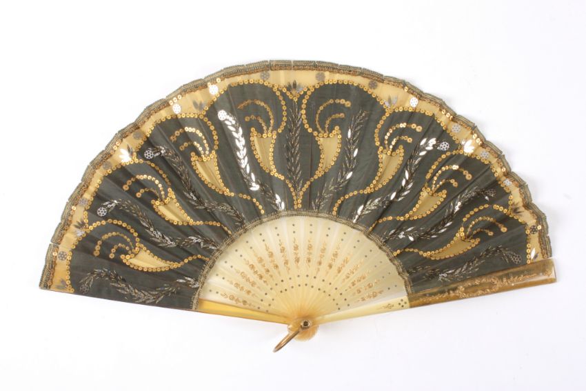 A horn bone and sequin fan the horn guard sticks and sticks decorated with floral sprays, the material fan finely decorated with sequins, contained within an associated Duvelleroy fitted caseDimensions: length 19cmCondition reportSome fraying to the material on the reverse of the fan, otherwise appears to be in good condition.