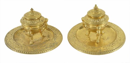 A pair of ornate gilt brass inkwells circa 1880 each with foliate cast well with three mounted cherubs on a circular base with foliate border Dimensions: diameter 25cmCondition reportone with missing finial, a little tarnished in places.ProvenanceSotheby's 'Ken Paul Prop Art', lot 1395 15/03/02