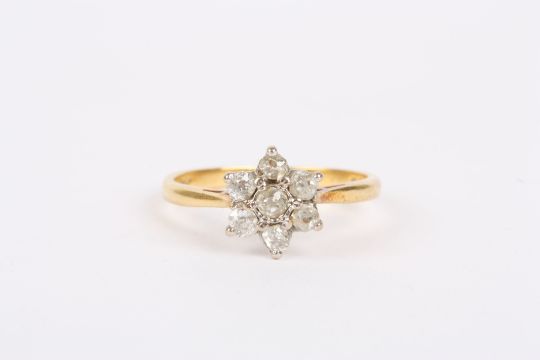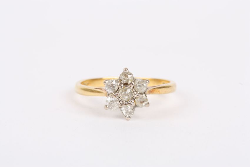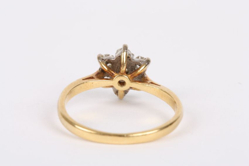 An 18ct gold and diamond ring the diamond set in flower head, the central diamond set with six diamond points to surround and six diamonds in the form of petalsDimensions: Condition reportwould benefit from a clean, but in good overall condition.