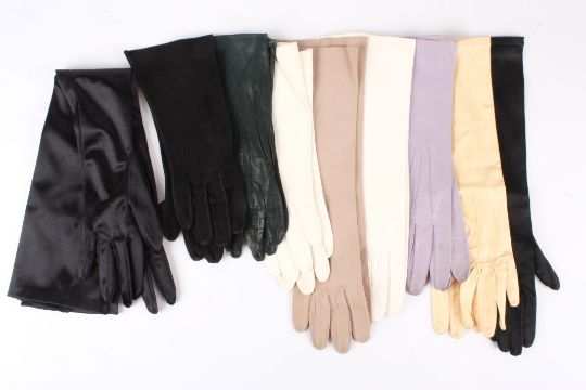 A collection of nine pairs of leather, satin and suede ladies evening gloves.Dimensions: Condition reportAll appear in generally good condition.