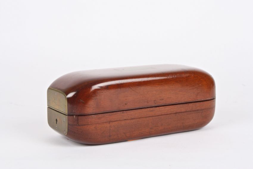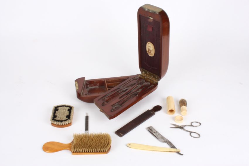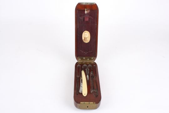 A gentleman's unusual 19th century mahogany cased travelling shaving set the case of unusual shape with sliding and locking action, carved recesses for tools, with partial contents, vacant brass cartouche.Dimensions: 25 cm long.Condition reportGood condition, lacking some contents.