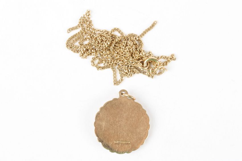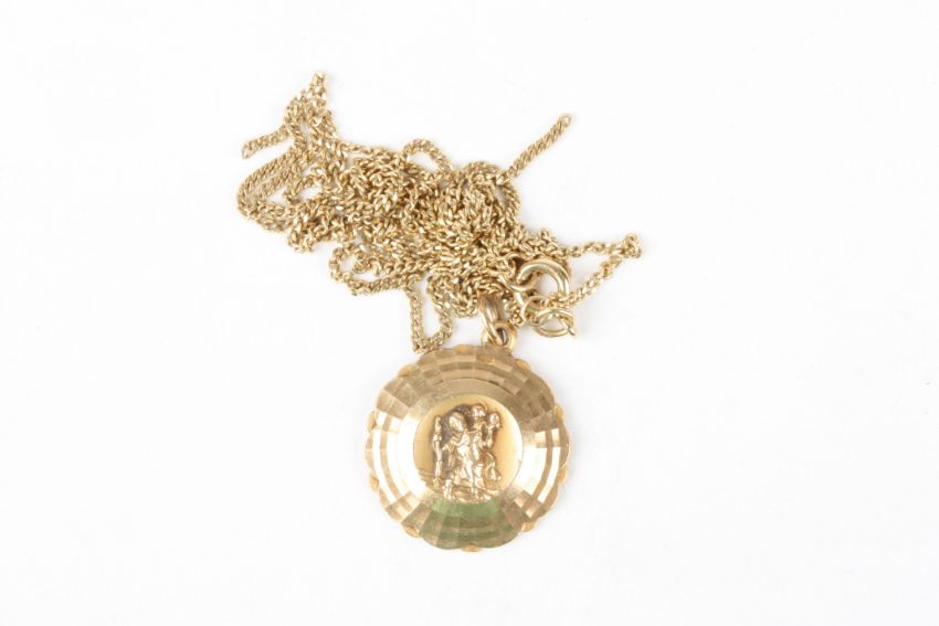A 9ct gold St. Christopher pendant on a 9ct gold chain.Dimensions: 10.5 grams.Condition reportChain snapped.