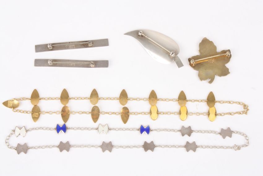 A small collection of jewellery comprising a Danish silver gilt and yellow enamel necklace with leaf decoration inscribed JEMax Sterling, Denmark; a Danish sterling silver Meka brooch with yellow enamel decoration in the form of a leaf; a Sterling silver leaf brooch inscribed S.C.F; and two Sterling silver pins with enamel decoration; and a silver coloured metal and blue enamel necklace (6)Dimensions: Condition reportAll in fair condition