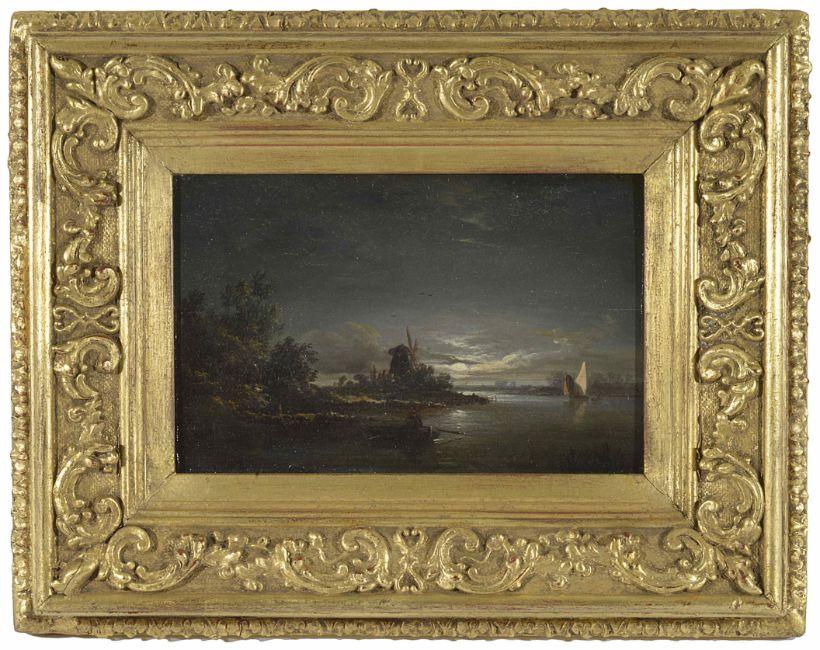Follower of Henry Bright, circa 1850 'A moonlit river scene' with boats and windmill, oil on panelDimensions: 14 x 21cmCondition report