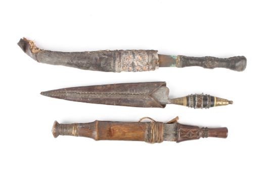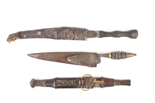 A group of three 19th century tribal daggers two with leather scabbards, one with wooden scabbard. (3)Dimensions: Condition report