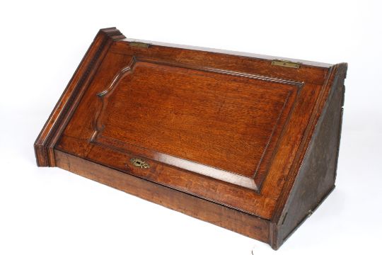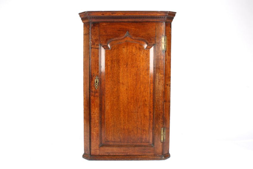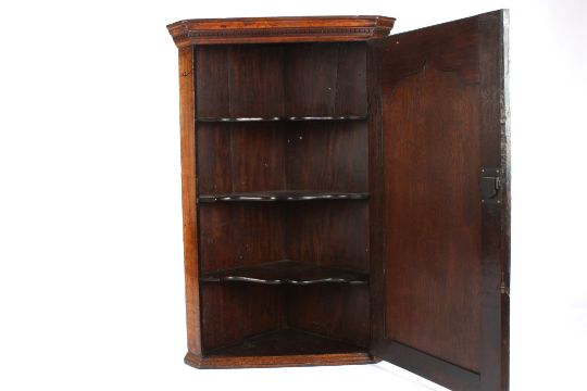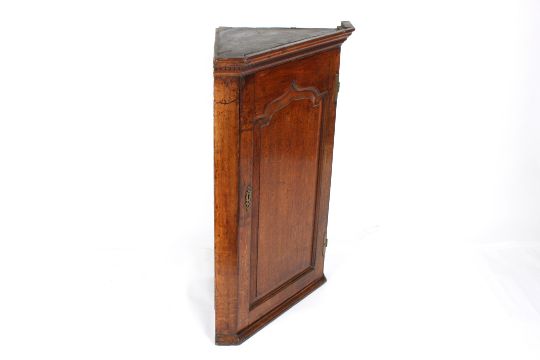 An 18th century oak corner cupboard the top with moulded cornice over a single panel door door opening to reveal three shelves to the interior.Dimensions: With split to the back of the cubboard, and fixing holes, in fair conditionCondition reportheight 100cm