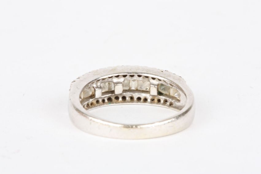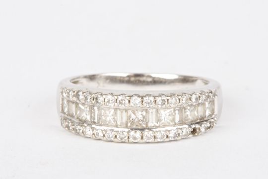 An 18ct white gold and diamond half eternity ring set with a row of alternating baguette and princess cut diamonds, flanked either side by a row of small brilliant cut diamonds. Shank faintly stamped 18K.Dimensions: Size O.Condition reportTwo small diamonds missing, marks on the shank rubbed.