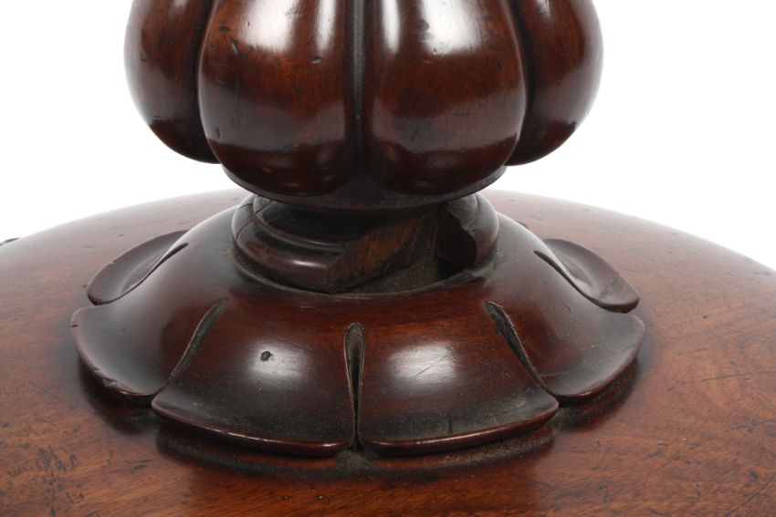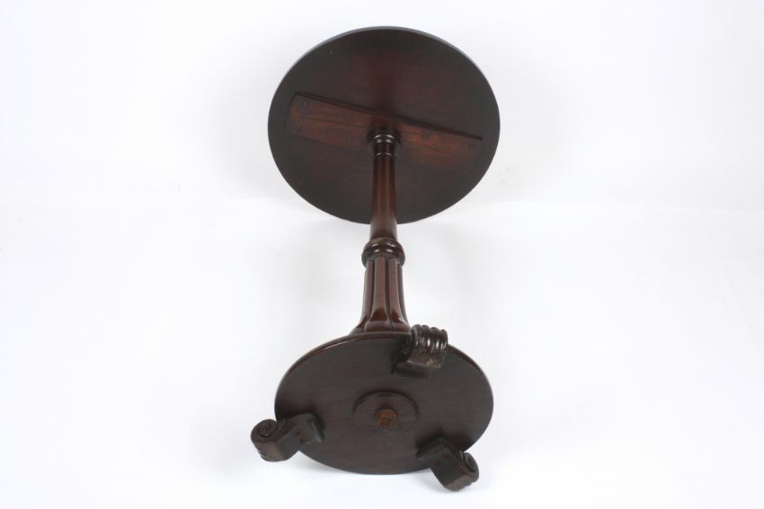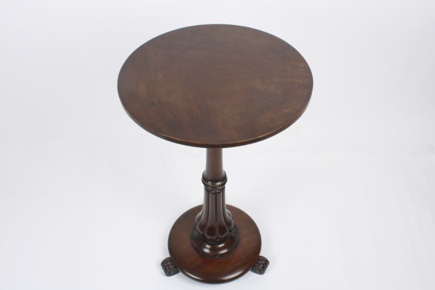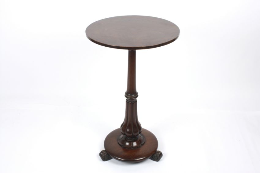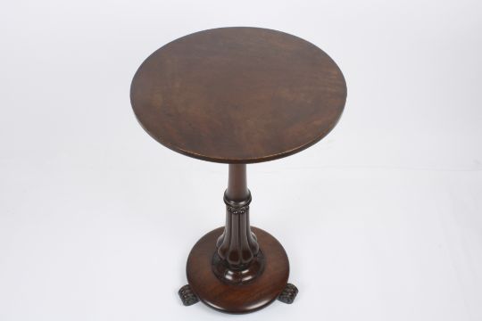 A Regency mahogany wine table the plain circular top supported on a tapered column, with fluted bulbous lower section to a lobed circular plinth base with three scrolled feet. Dimensions: 45cm diameter, 74cm high.Condition reportFew scratches to the top, split to underside supporting bar and small chunk missing from lower bulbous section, otherwise fairly good condition.