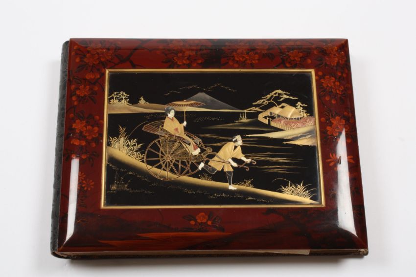 An early Japanese lacquer shibayama photo album the cover finely decorated with a scene of a man pulling a carriage carrying a lady with parasol in a landscape, containing a number of coloured photographs of Japan.Dimensions: Condition reportGenerally in very good condition.