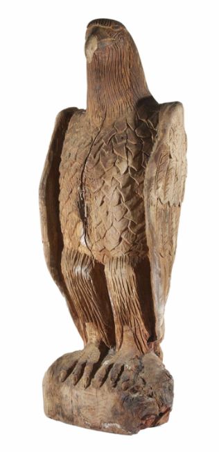 A large carved decorative wooden eagle probably late 19th/early 20th century realistically carved, standing on a branchDimensions: height 98cm., width 34cmCondition reportWith large split to the centre, and wear with age.