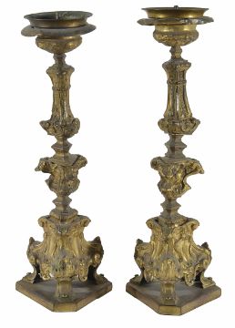 A pair of decorative gilt brass repoussé candlesticks possibly 18th centuryDimensions: height 42cmCondition reportLight weight and dented in a number of placesProvenanceSotheby's 2007