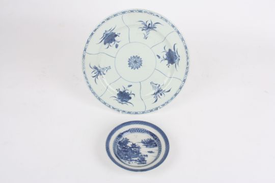 A 19th century Chinese circular blue and white plate, decorated with six panels of flowers with central roundel, together with a small blue and white saucer decorated with a landscape scene with pagodas and a boat (2).Dimensions: 28 cm and 15.5 m diameter.Condition reportLarge with several rim chips, small chip to rim.