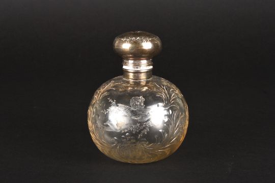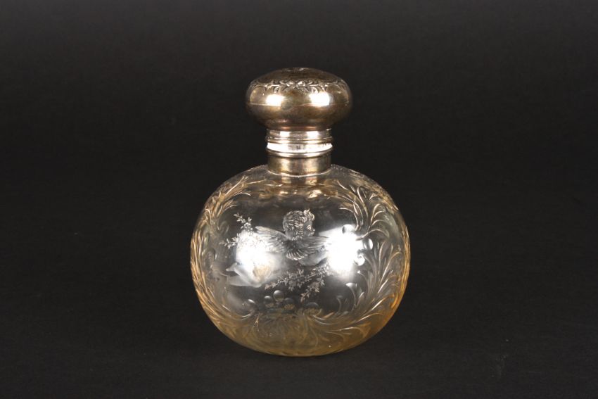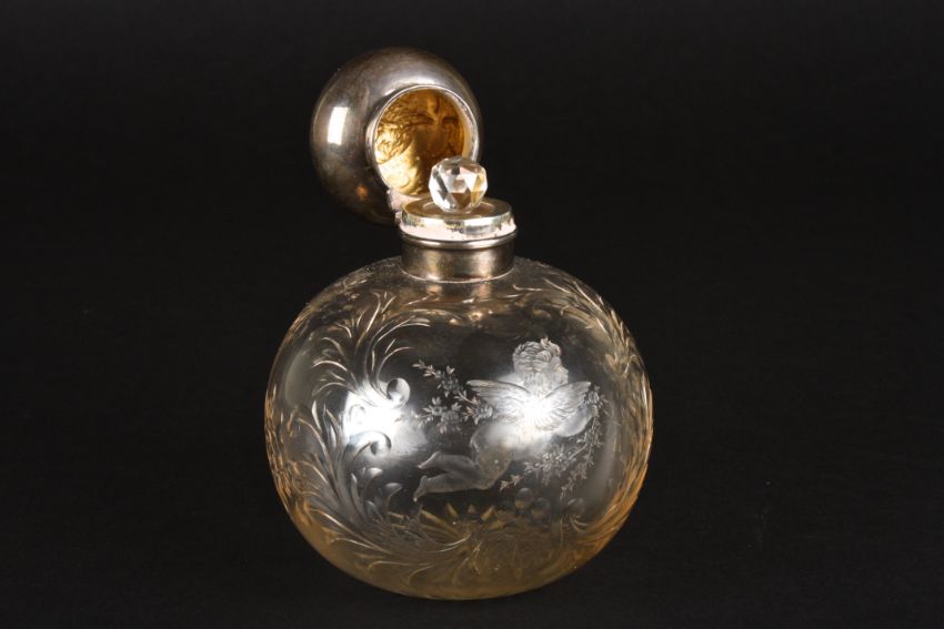 A Victorian silver and cut glass scent bottle hallmarked Birmingham 1898, the silver top decorated with cherubs, the glass body with further engraved decoration of cherubs and scrolls and star cut base, internal stopper present. Makers mark: Henry Matthews.Dimensions: 12 cm high.Condition reportGenerally good condition, although internal stopper is stuck.