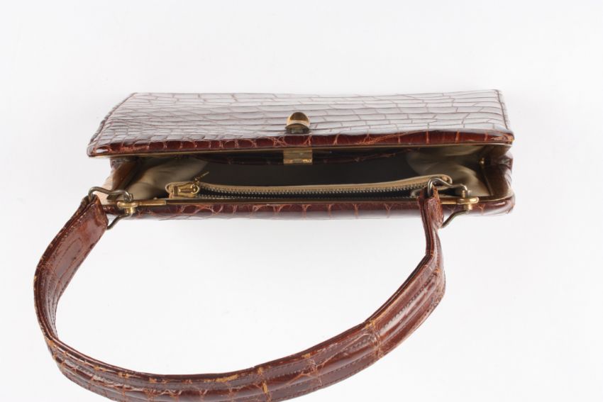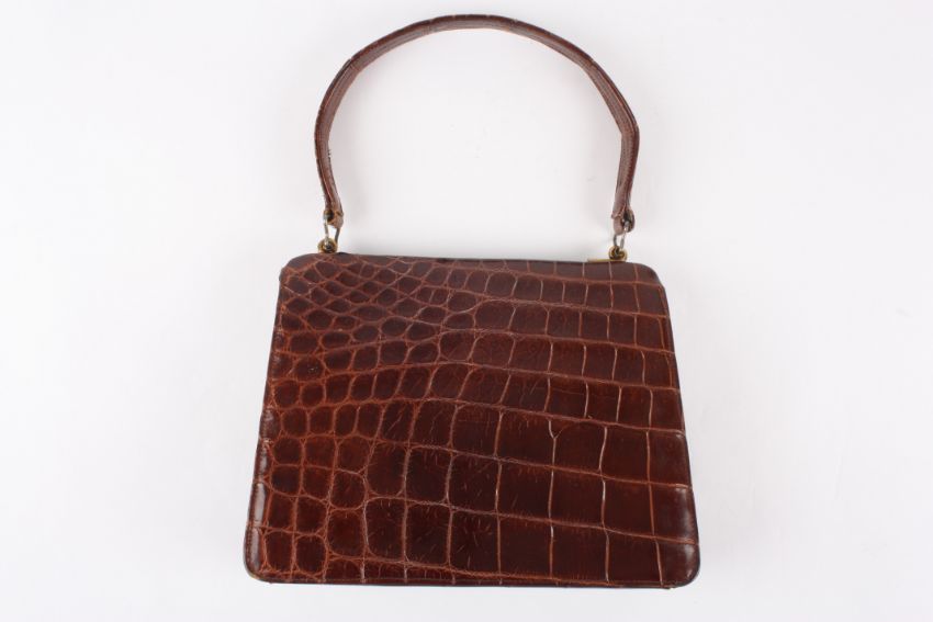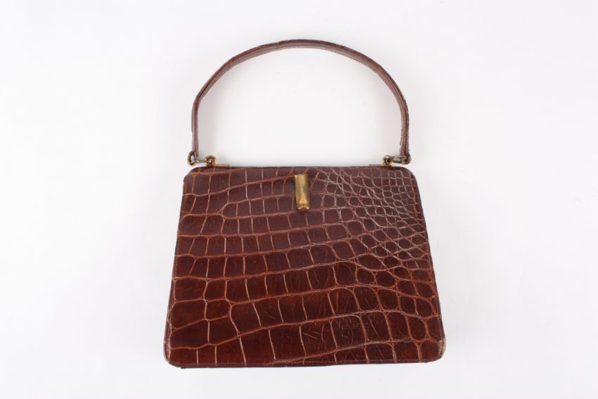 A 1930's crocodile handbag of slightly tapered form, the brown coloured bag with gold coloured clasp. Inside zip compartment plus a small leather purse attached to the inside with a gold coloured chain.Dimensions: Condition reportSome wear but overall good condition.