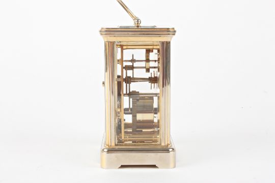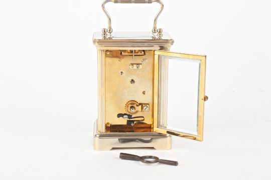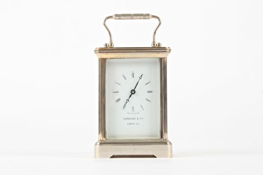 A 20th century Garrard & Co. silver plated carriage clock with white dial and black Roman numerals, the dial signed Garrard & Co., London, with carrying handle and plain case.Dimensions: 15.5 cm high incl. handle.Condition reportAppears in good condition, but movement not tested, very light plate wear in places.