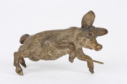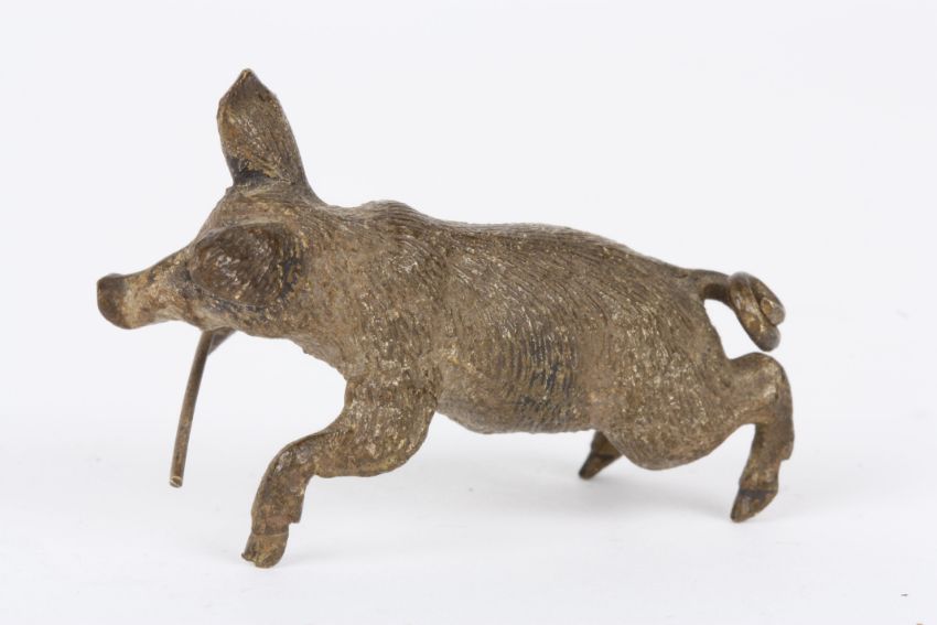 An early 20th century Austrian cold painted bronze pig in a standing pose and holding a stick, indistinct impressed mark between legs. Dimensions: 5.5cm high.Condition reportGood condition, foot slightly bent. Not standing upright correctly.