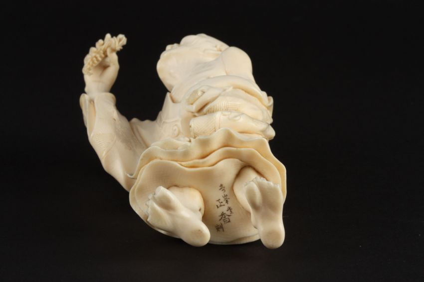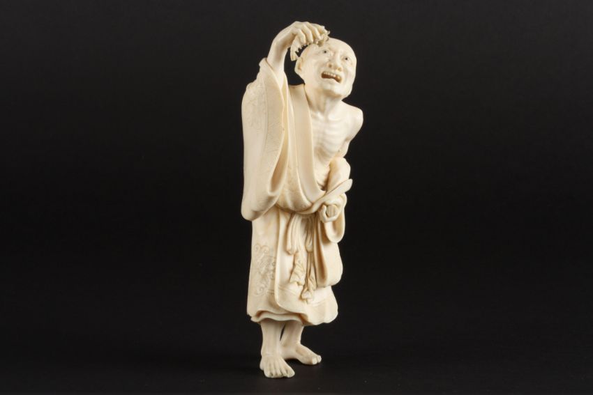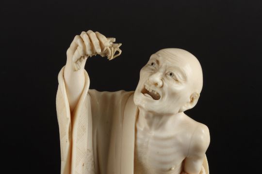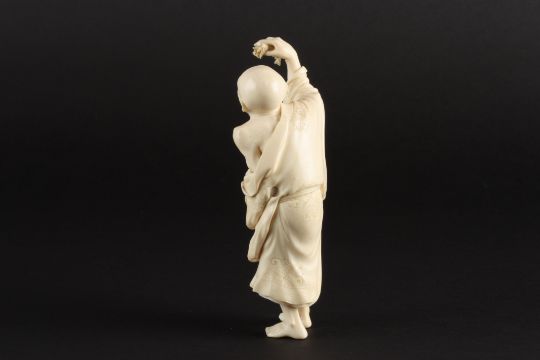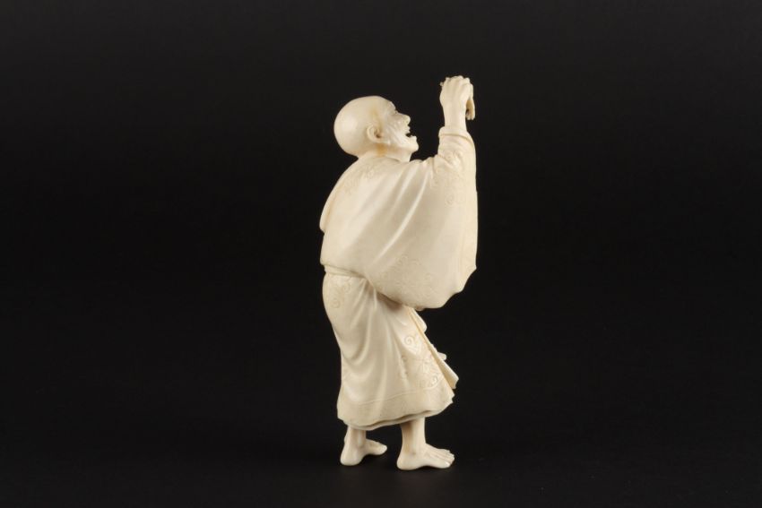 A Japanese ivory okimono figure of a man with a lobster probably early 20th century the standing figure of a man with outstretched arm holding a lobster, with carved signature Dimensions: length 15cmCondition reportThe man initially held a sword of some description which is no longer there and has broken off. Some minor nibbling to the feet. Otherwise generally in fair condition.