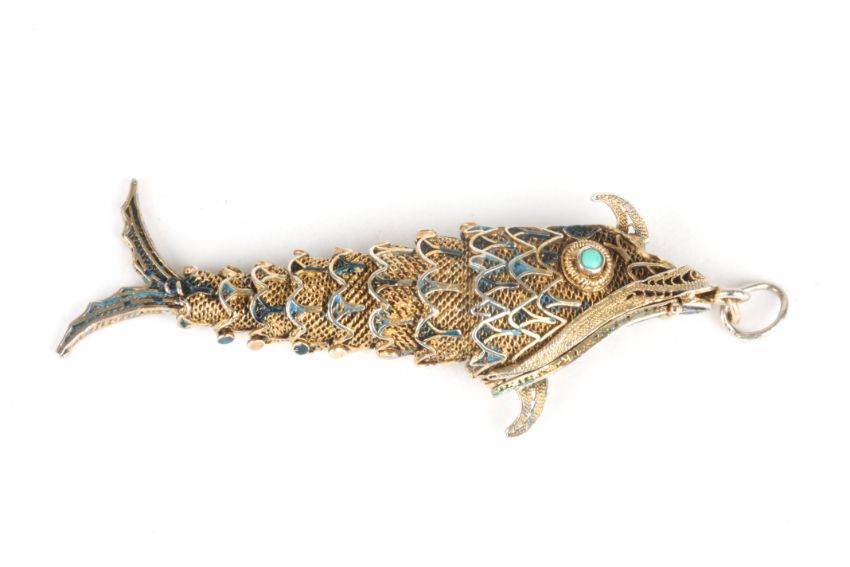 A filigree silver gilt and enamel locket in the form of a fish with articulated body, and hinged opening mouth, with turquoise eyes, 6 cm long.Condition: Good condition, some light enamel losses.