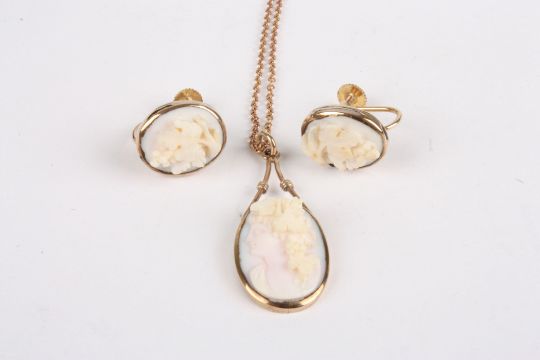 Three carved cameo brooches carved with portraits of women, one in a white metal mount, two in gilt metal mounts, together with a pendant and pair of earrings (5), Largest 3.5 x 3 cm.Condition: Largest cameo cracked.