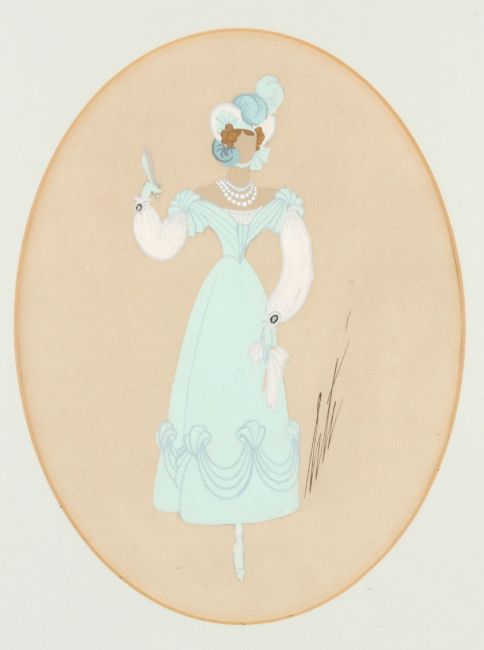 Erte (1892-1990) Theatrical costume design 1950s pencil and hand colour, signed in pen, probably a design for a theatrical costume, the lady holding a fan wearing a pale blue dress, pearls and head dress, overall with frame 47 x 34cmCondition: Good colour, no overall damage. loose at the back from frame - just needs securring.Provenance: Current owner's father used to work for theatrical costume designers Alex Shanks Stage Costume Ltd and was given these Erte costume designs by Erte as a gift.