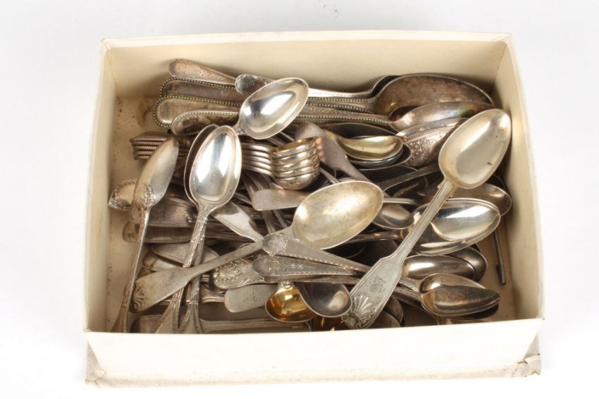 A collection of assorted Georgian, Victorian and later silver cutlery including table spoons and teaspoons, of various dates, including several plated items. Approximately 40 ozt.Condition: Most in good condition, with some wear.