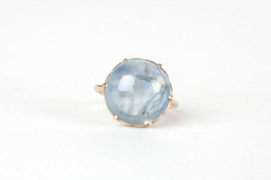 A large cabochon pale blue sapphire ring set with stone measuring 16x15x8mm, in a plain unmarked yellow gold mount, Size M 1/2Condition: Fair condition, cloudy in some places - first hand inspection suggested
