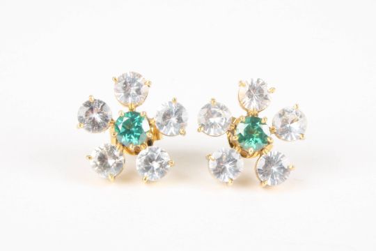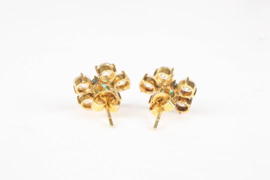 A pair of white sapphire and emerald flower head earrings each set with a central emerald weighing approximately 0.40cts, surrounded by five white sapphires of similar size, set in 18ct yellow gold with post mounts, Condition: Good condition with no damage.
