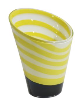 Gianni Versace for Venini 'Asimmetrico' lemon and white striped asymmetric vase with black base, signed Venini '98 Gianni Versace, with original sticker, height at the highest point 24.25cmCondition: Provenance: Versace and Venini teamed up in the 1990s to produce an exclusive collection of hand-blown contemporary glass vases.