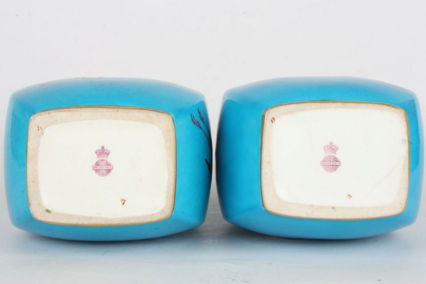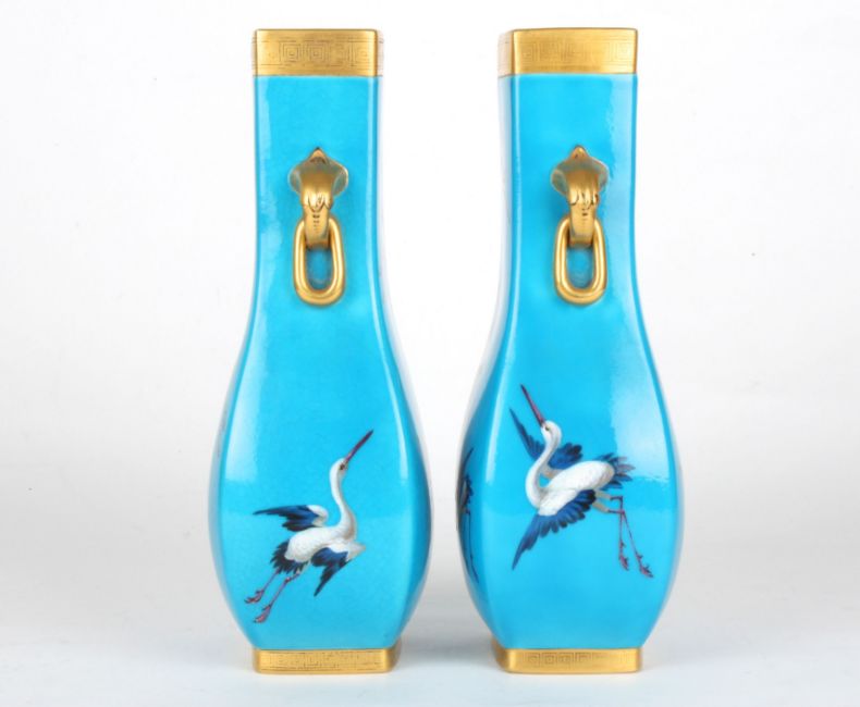 A large pair of Victorian Minton turquoise glazed bottle vases painted with cranes in flight, with rectangular necks and bulbous bodies, with gilt ring handles, printed mark to base, 28 cm high.Condition: Both with glaze crazing and several hairline cracks, one with tiny chip to foot, no major damage.
