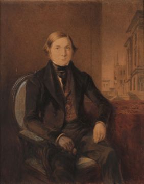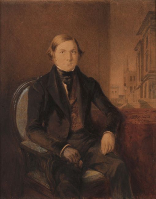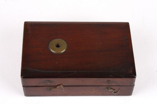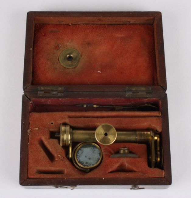 A 19th century simple brass microscope contained within a fitted mahogany case together with a watercolour portrait of the original owner, and documentation relating to the owner, Condition: The microscope incomplete, and does not screw in to the top properly - perhaps the base is missing the thread. the portrait in fair condition.