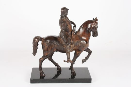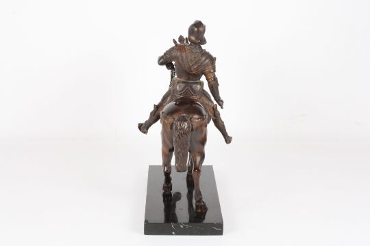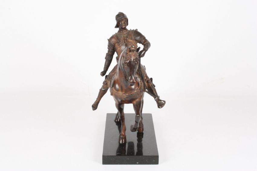 A 20th century bronze horse the heavily cast sculpture depicting a warrior on a horse wearing armour, on marble base, width of base 48cmCondition: