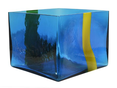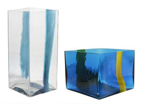 Ludovico Diaz de Santillana (1931-1989) for Pierre Cardin 1969 blue vase of square form decorated with vertical yellow coloured stripe, with etched signature venini Pierre Cardin, together with a clear rectangular vase with blue coloured vertical stripe, also marked (2), the former height 19.5cm width 24.5cm, the other height 40cm width 18cmCondition: Provenance: The glassware designed for Pierre Cardin was believed to be presented at the fashon show staged at Maison Pierre Cardin in Paris in 1969, where each item was carried in by one of the fashion models presenting Cardin's new line. p.224 'Venini Catalogue Raisonne 1921-1986', Skira